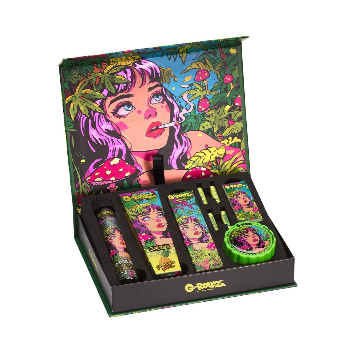 Experience the magic of the G-Rollz “Mystikal Maze” Gift Box—a bold, vibrant, and comprehensive rolling kit for the modern smoker.