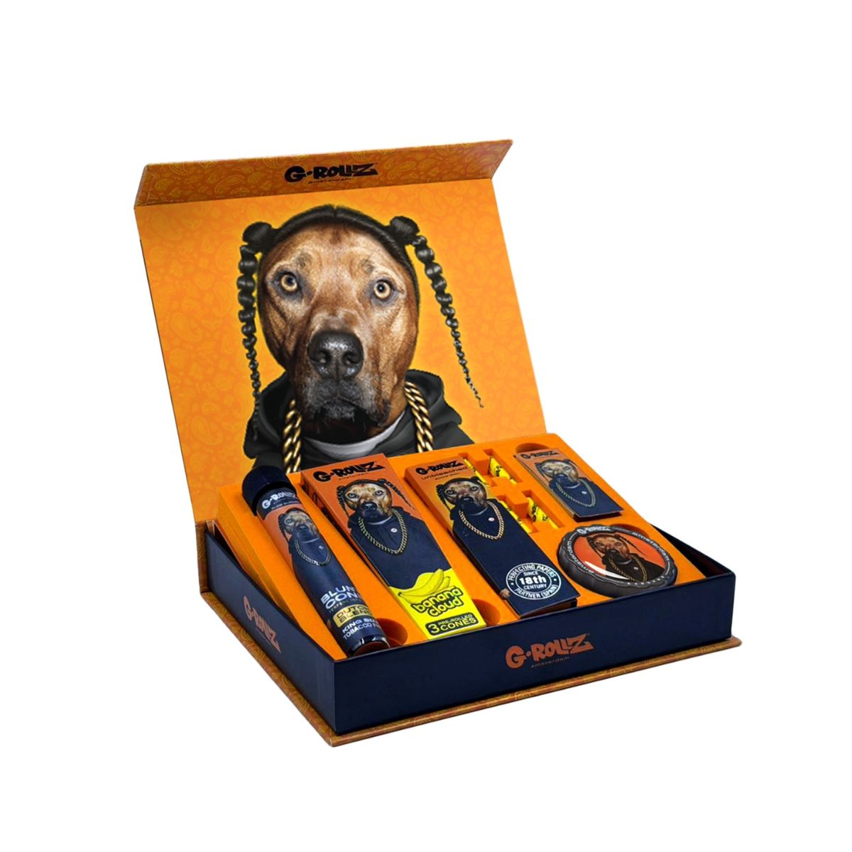 G-Rollz Rap Gift Box XS containing rolling tray, papers, and tips.G-Rollz “Rap” Gift Box – XS Rolling Set – Packed With Products